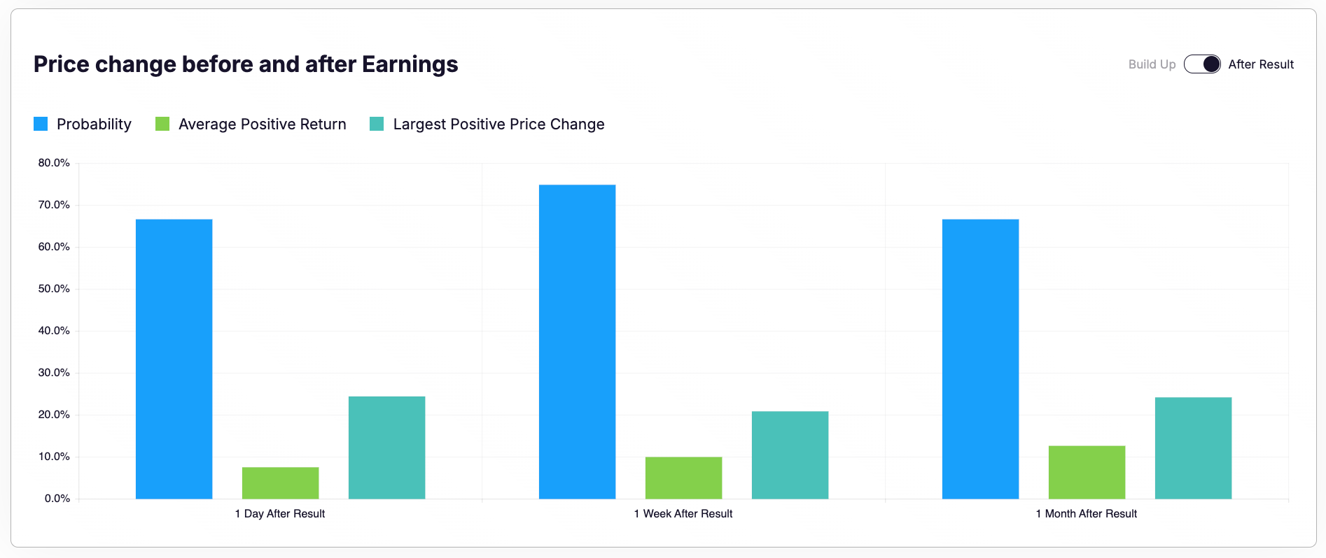 One week after earnings, the stock shows a 75% chance of finishing higher, with an average gain of 10.1% and a maximum weekly move of 20.8%.