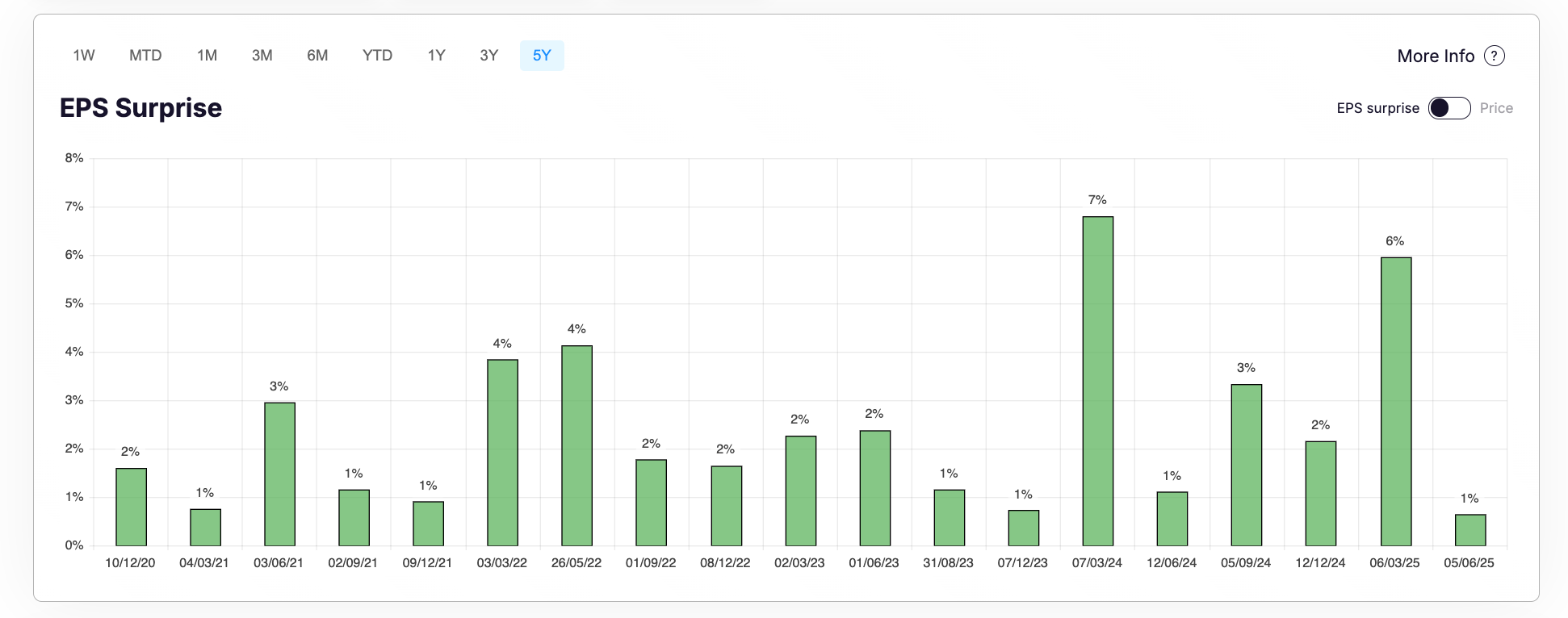 Over the past five years, Broadcom has delivered an earnings surprise 100% of the time. Similar to Nvidia, “surprise” may now be the expectation.